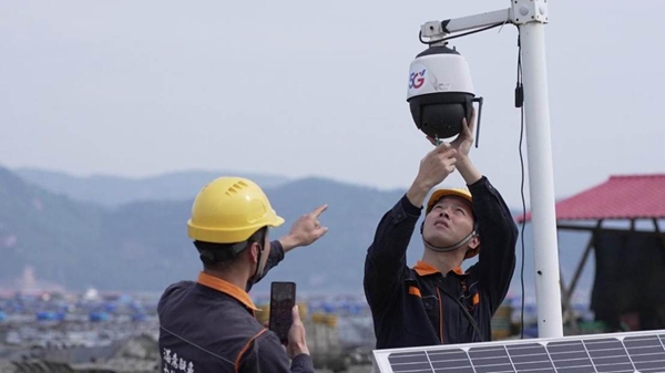 時下正值霞浦大黃魚放苗關(guān)鍵期。海面上漁排連片,養(yǎng)殖戶忙著投放魚苗,中國電信寧德分公司裝維人員穿梭其間,為漁民調(diào)測網(wǎng)絡(luò)和天翼AI攝像頭。