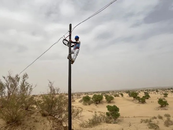 2023年有一次沙塵暴吹斷了電線桿,整個村子都沒有網(wǎng)絡和電話信號,村黨支部書記跑到85公里外的村子給電信維護部門打電話。艾力接到消息后,和同事連夜出發(fā),凌晨趕到事故現(xiàn)場開始搶修。他獨自在沙漠中徒手檢查了500米光纜,終于定位故障。修復完成時已是清晨七點,天光早已大亮。