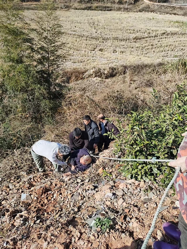 寒風(fēng)刺骨,池水冰冷,老人因受驚和失溫不斷顫抖。情況緊急,隊(duì)長(zhǎng)胡儉懷當(dāng)即決定下水施救,范毅、曾江波則迅速展開(kāi)協(xié)作:一人在坡上死死拉緊安全繩,為下方救援提供穩(wěn)固支撐;一人則手腳并用攀下陡坡,穩(wěn)穩(wěn)托住老人身體,同時(shí)與趕來(lái)的村民合力搭成人梯,在荊棘叢生的坡面開(kāi)辟出一條生命通道。在工作隊(duì)隊(duì)員、村干部及村民的通力協(xié)作下,14時(shí)20分左右,王德春老人被成功轉(zhuǎn)移至安全地帶。經(jīng)隨后趕到的醫(yī)生檢查,老人身體無(wú)大礙。