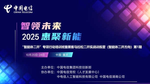 2025年“智能體二開”專項行動培訓(xùn)班暨黑客馬拉松二開實戰(zhàn)訓(xùn)練營(智能體二開)第1期于10月20日在重慶正式開班。本次培訓(xùn)由中國電信集團公司科技創(chuàng)新部主辦,聯(lián)合中國電信黨校、中電信人工智能科技有限公司、中國電信湖南公司共同協(xié)辦,采取主——中國電信集團、實——中國通信服務(wù)股份有限公司、?!须娦湃斯ぶ悄芸萍加邢薰救w協(xié)同的創(chuàng)新賦能模式,吸引了來自全國28個省市及中通服的145名學(xué)員參與。培訓(xùn)以“訓(xùn)-戰(zhàn)-評”一體化閉環(huán)模式,結(jié)合線上線下教學(xué),旨在通過實戰(zhàn)實訓(xùn)提升學(xué)員在智能體二次開發(fā)方面的能力,推動AI技術(shù)規(guī)?;瘧?yīng)用與人才隊伍建設(shè)。
